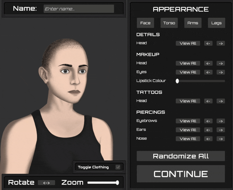 This is because all the things that are included in this panel, such as skin details, makeup, tattoos, and piercings, are all essentially just ‘overlays’ on the existing body parts of the character, meaning they are far easier to draw, import, rig, and implement, than all the previous categories.