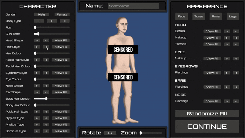 To sum up all the new features – we now have full part customisation for every single field on the left side (yes, including those last few – but I’ll leave them for you to discover in-game). The system now supports dynamic pop-up grids (which automatically sort and include any mod-added content), dynamic preview generation (which can either create previews automatically to match vanilla parts or display custom thumbnails provided by mod authors), full body hair presets for both genders, and simple character rotation that accounts for asymmetrical sprite swapping, with left/right part swapping for asymmetrical tattoos, piercings, and details coming soon.